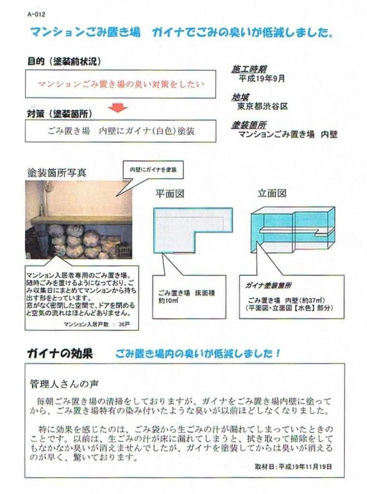 毎朝ごみ置き場の清掃をしておりますが、ガイナをごみ置き場内壁に塗ってから、ごみ置き場特有の染み付いたような臭いが以前ほどしなくなりました。